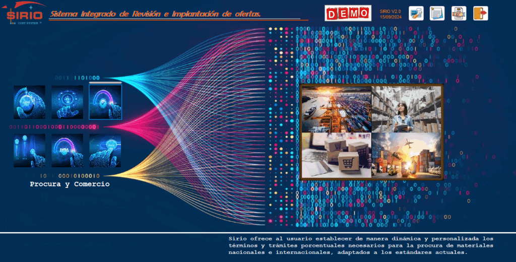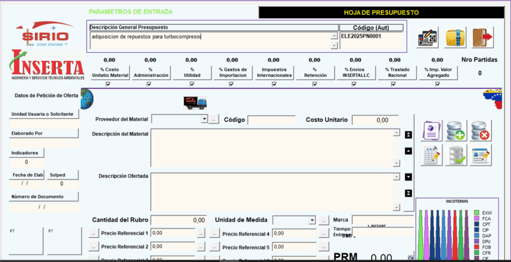 Sirio permite al usuario establecer los términos y trámites económicos necesarios para la procura de materiales Nacionales e Internacionales, adaptados a los estándares actuales. Esta herramienta permite al estimador definir el impacto en el precio final de un bien material o equipo, según los criterios establecidos en los INCOTERMS actuales, ya sea riesgos, seguros, costos, gastos, fletes, impuestos y tasas aduanales acordados por las partes involucradas en un contrato de compra venta internacional.